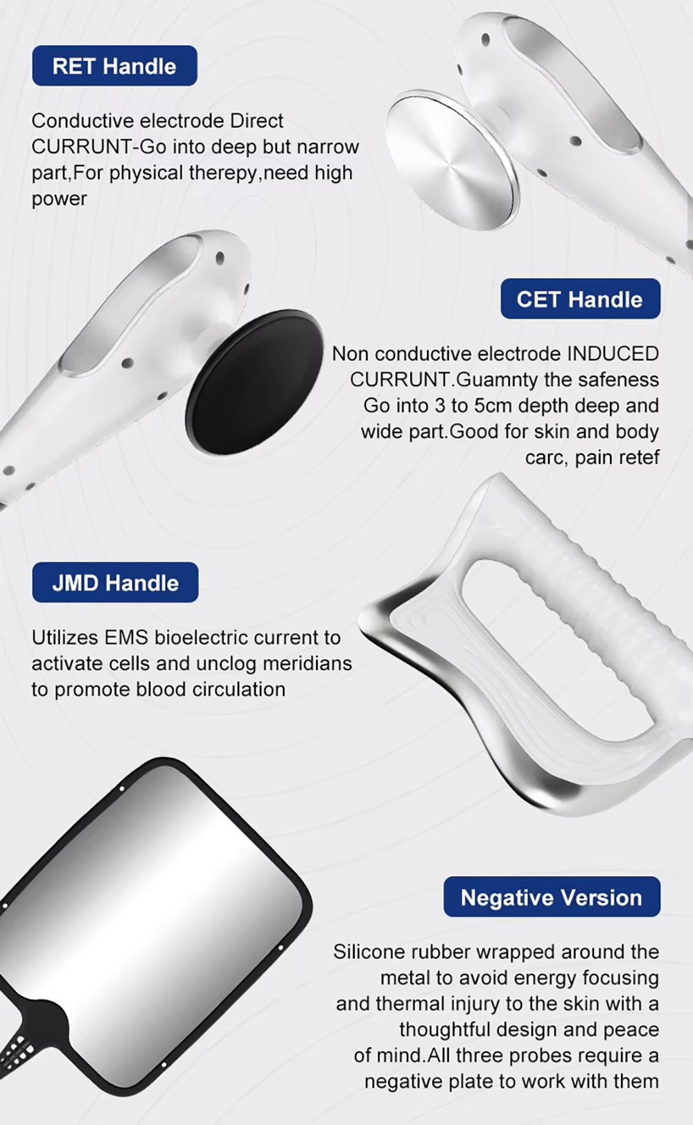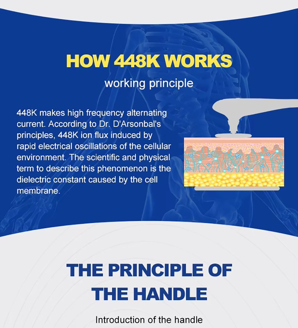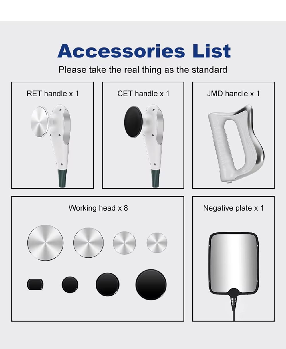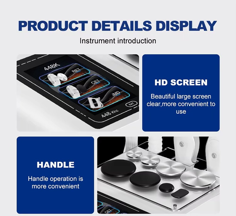 This is the YT728 448KHZ RF Tecar Therapy RET CET Diathermy Body Sliming Pain Relief Skin Tightening INDIBA Deep Care Machine, adopting 448KHz professional therapy technology. It promotes cell regeneration, boosts blood circulation, diminishes inflammation, activates fibroblast activity, non-invasive and painless. It can relieve pain and injury on shoulder, neck, waist, back, knee, elbow, muscle and joint. Equipped with RET/CET/JMD handles and 8 working heads.
