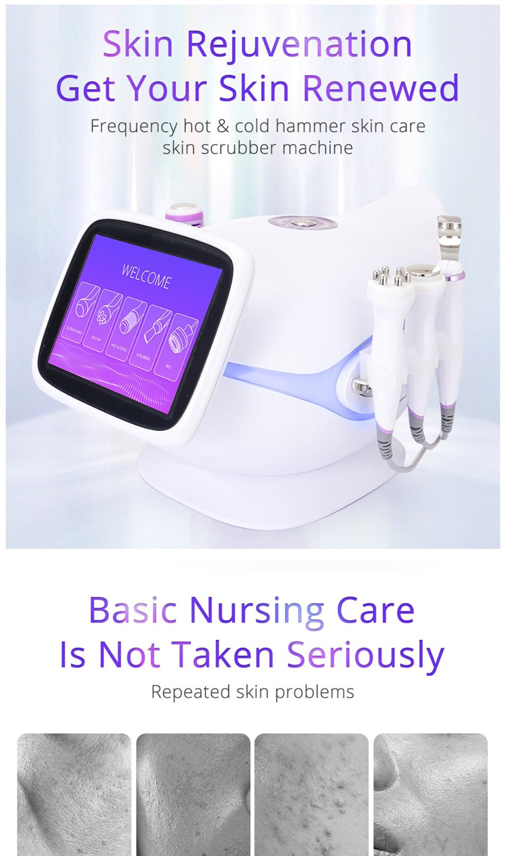 This is YT729 5 in 1 Multifunctional Photon Ultrasound RF LED Microcurrent Hot&Cold Hammer Acne Treatment Skin Scrubber Machine, integrating 5 core functions: 6-polar 3D RF, ultrasonic skin scrubber, hot & cold hammer, ultrasonic introduction, and photon microcurrent. It deeply cleanses, moisturizes, exfoliates, lifts, tightens, and rejuvenates skin, solving roughness, dullness, oiliness, acne and other skin problems, ideal for professional salon skin management.