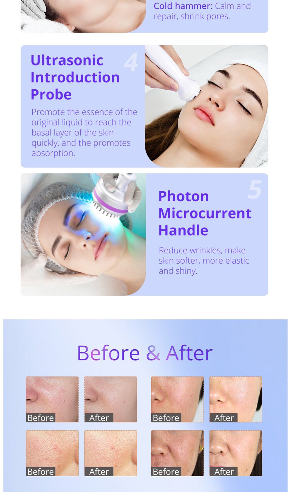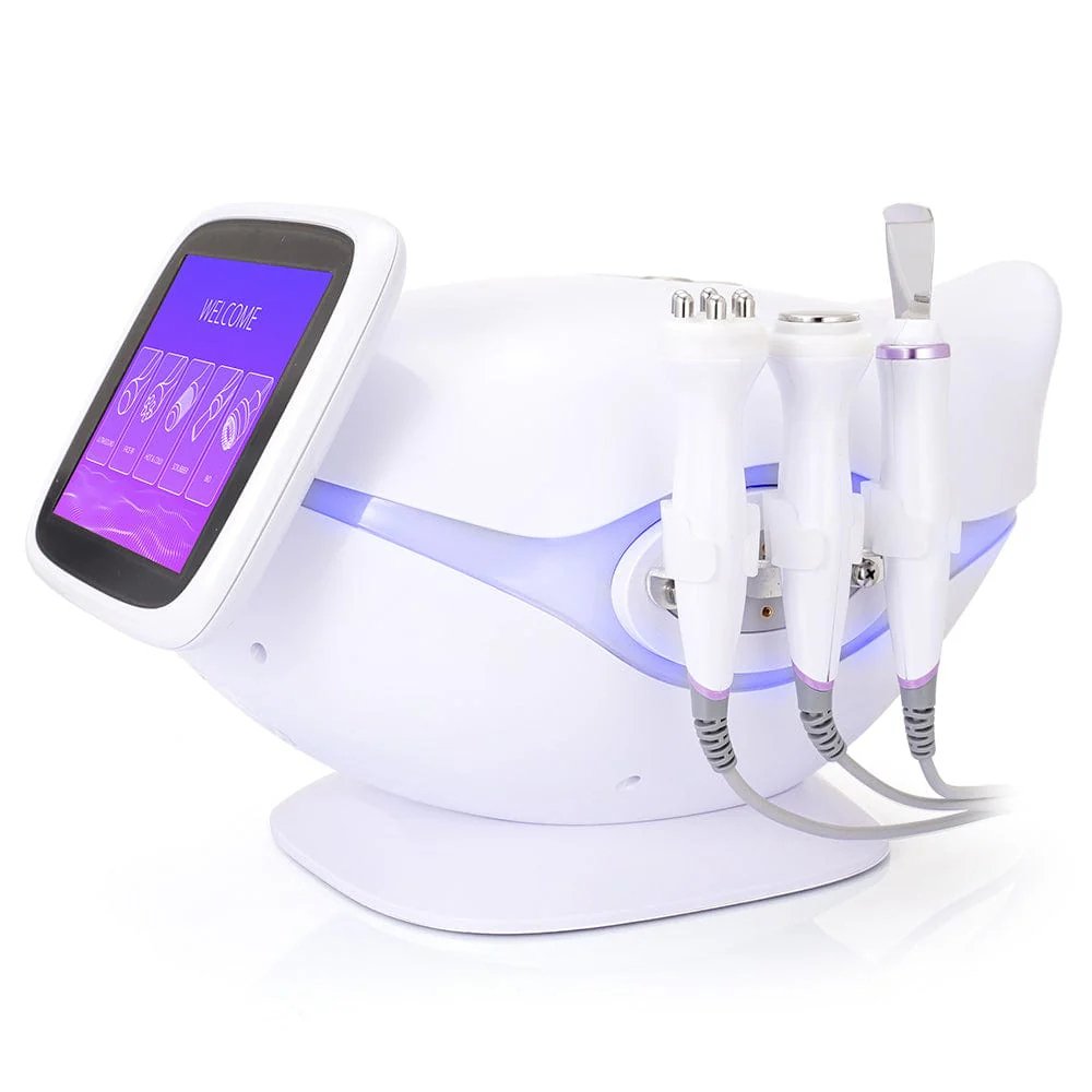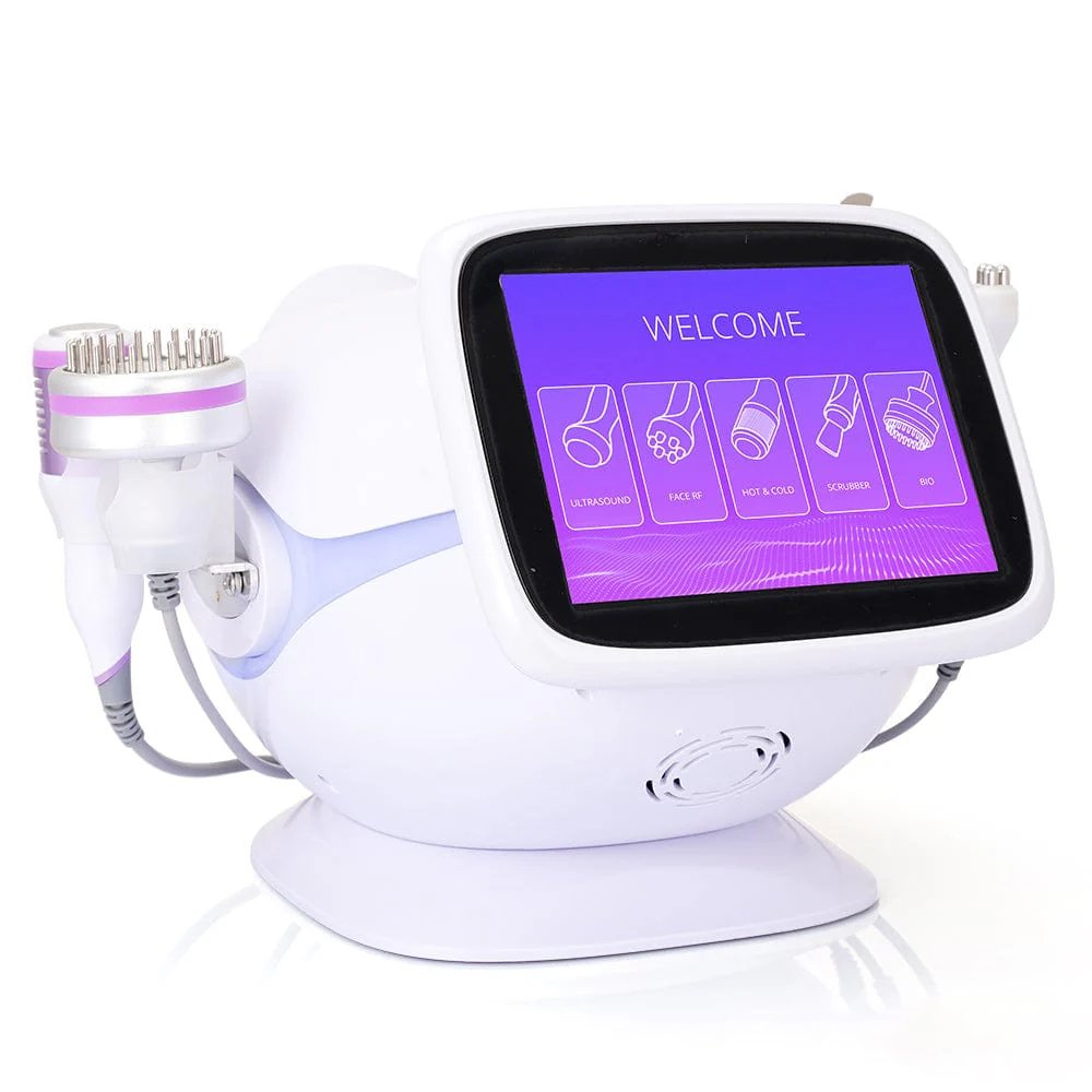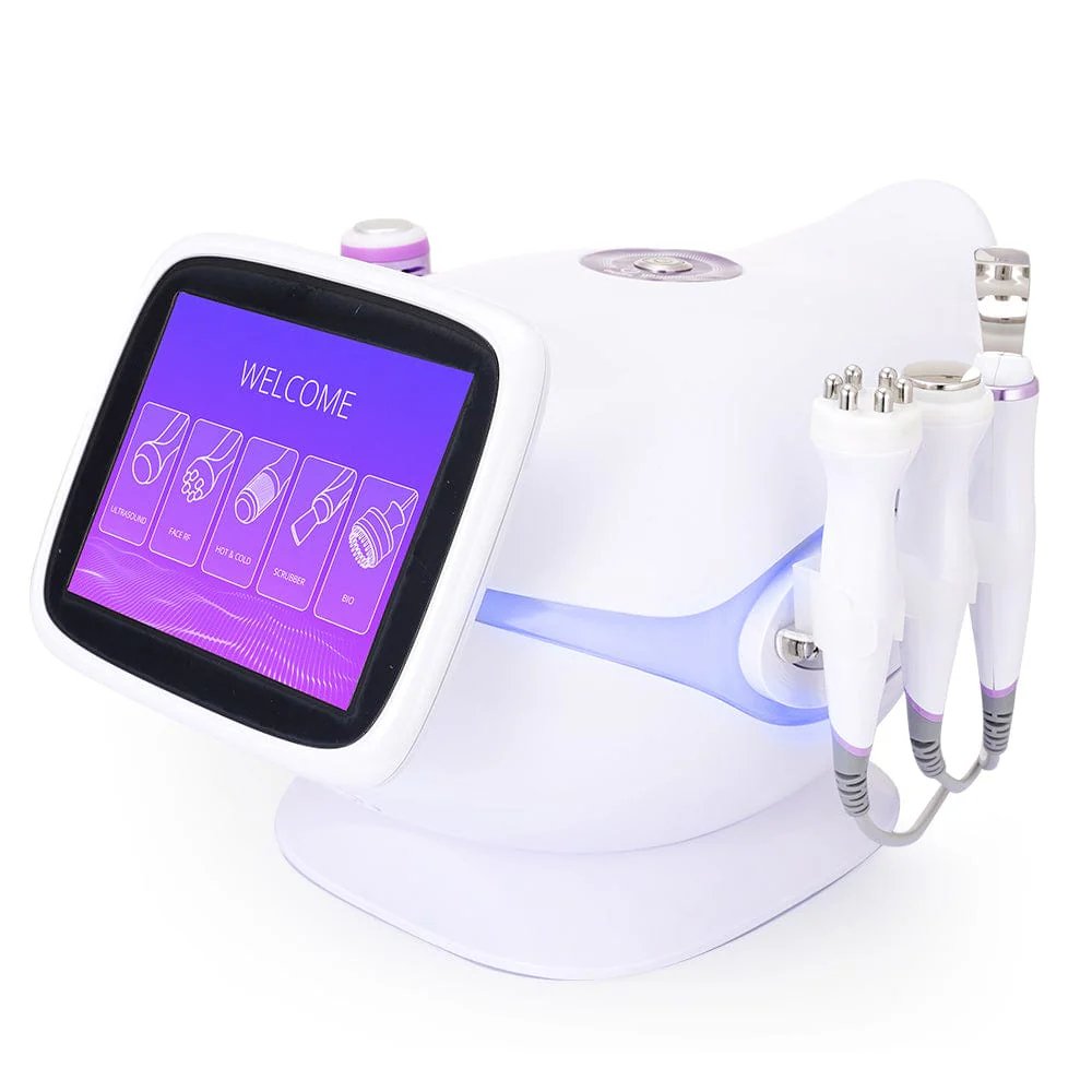 This is YT729 5 in 1 Multifunctional Photon Ultrasound RF LED Microcurrent Hot&Cold Hammer Acne Treatment Skin Scrubber Machine, integrating 5 core functions: 6-polar 3D RF, ultrasonic skin scrubber, hot & cold hammer, ultrasonic introduction, and photon microcurrent. It deeply cleanses, moisturizes, exfoliates, lifts, tightens, and rejuvenates skin, solving roughness, dullness, oiliness, acne and other skin problems, ideal for professional salon skin management.