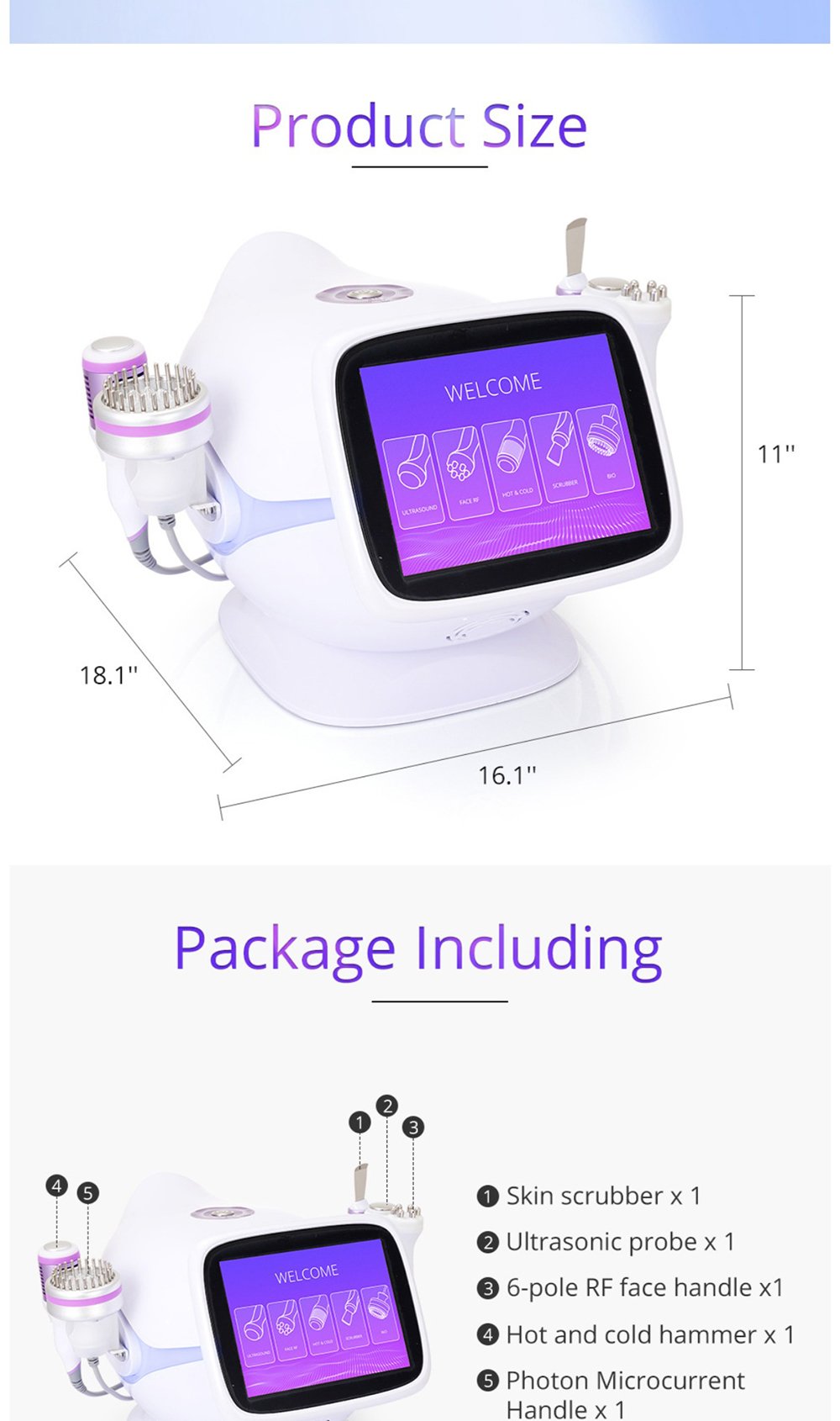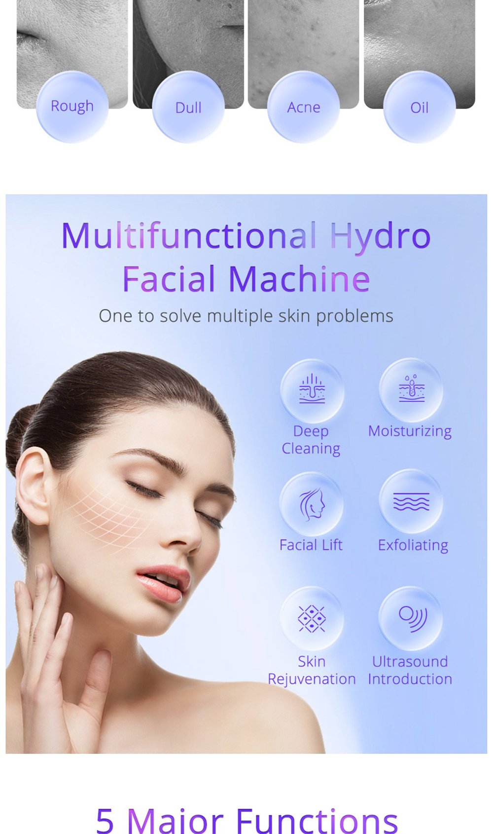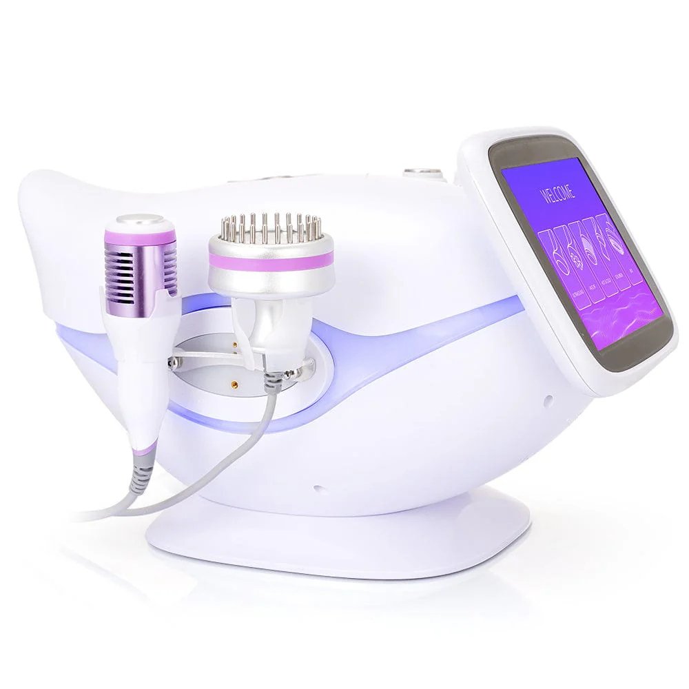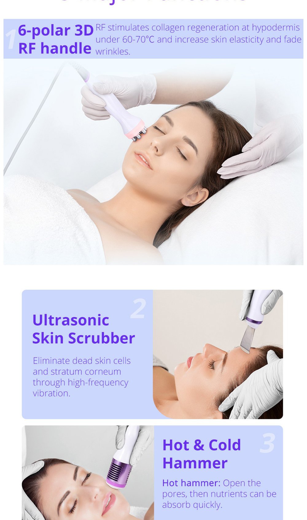 This is YT729 5 in 1 Multifunctional Photon Ultrasound RF LED Microcurrent Hot&Cold Hammer Acne Treatment Skin Scrubber Machine, integrating 5 core functions: 6-polar 3D RF, ultrasonic skin scrubber, hot & cold hammer, ultrasonic introduction, and photon microcurrent. It deeply cleanses, moisturizes, exfoliates, lifts, tightens, and rejuvenates skin, solving roughness, dullness, oiliness, acne and other skin problems, ideal for professional salon skin management.