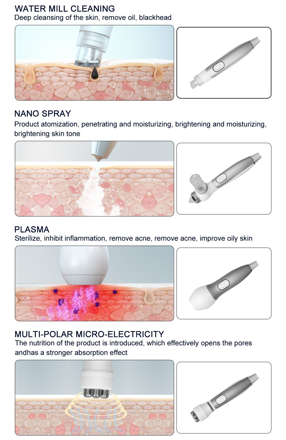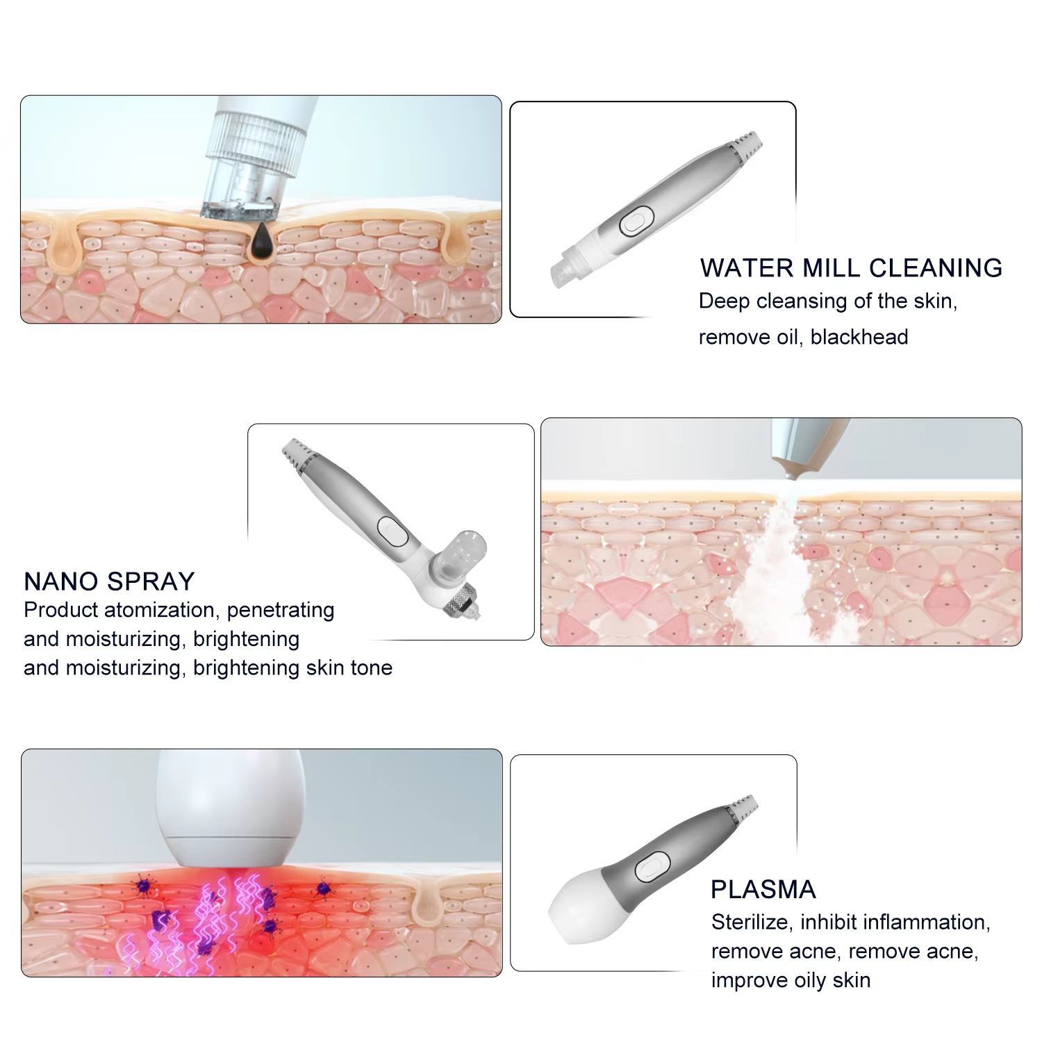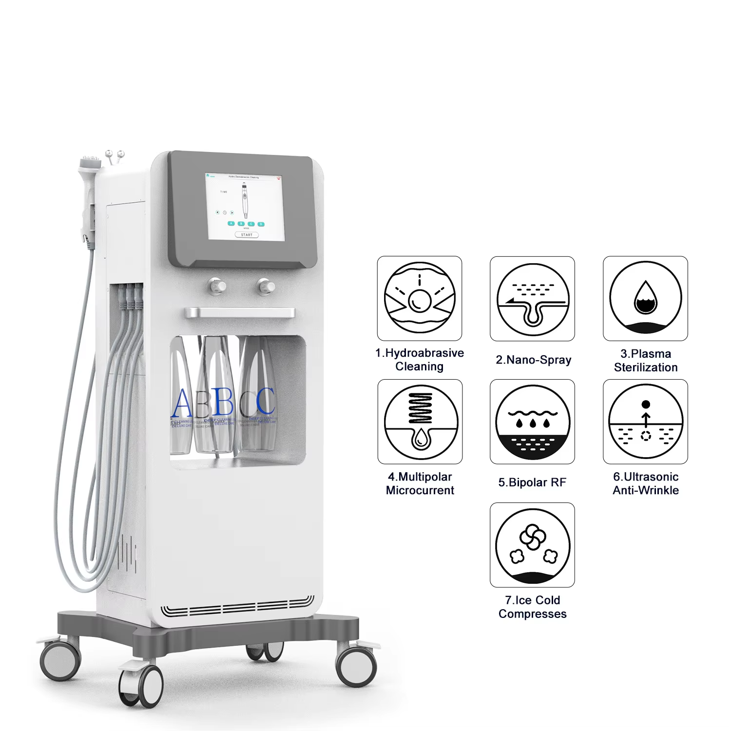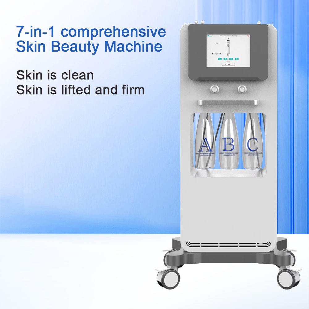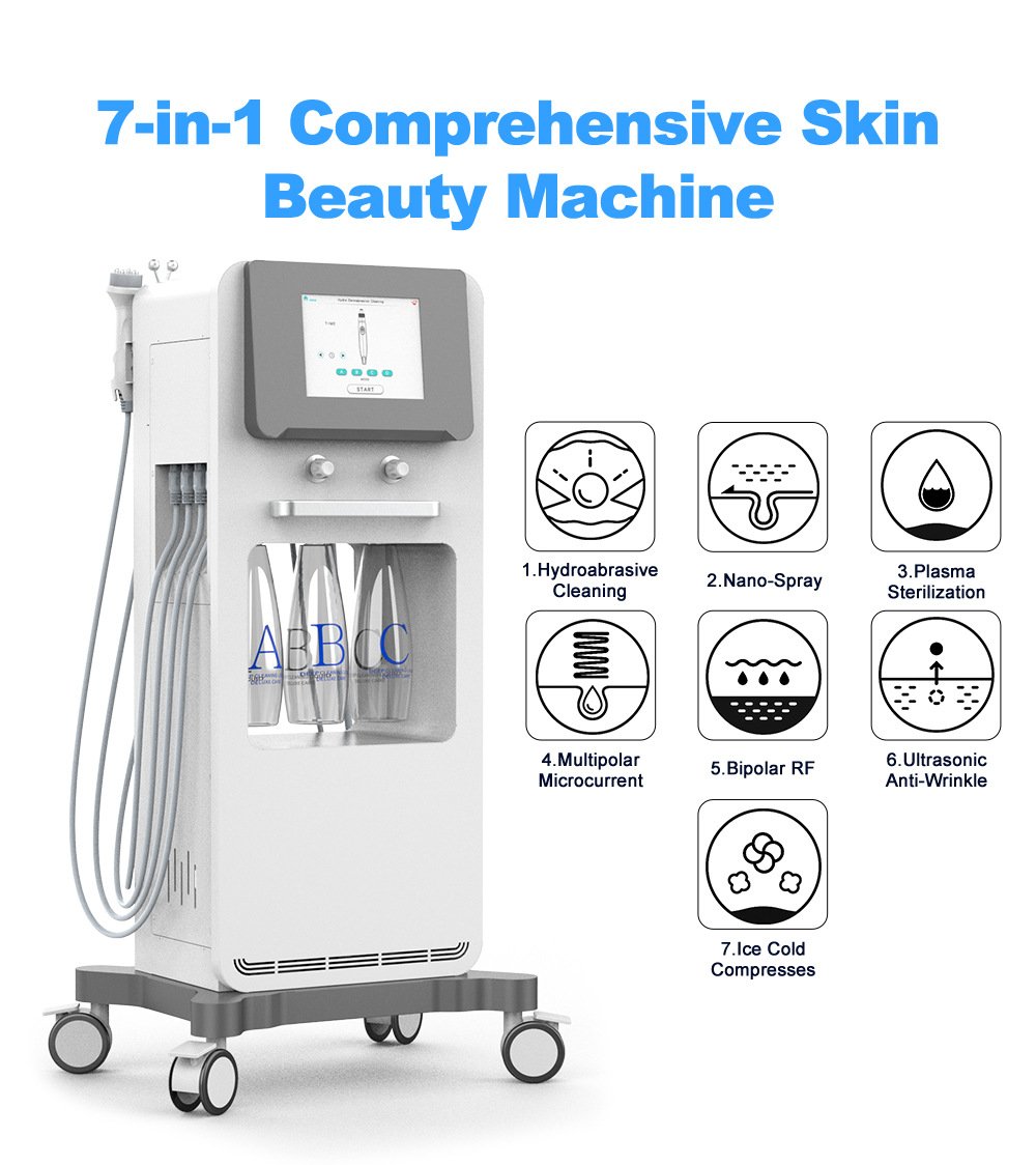 This is YT711 7 in 1 Professional Oxygen Jet Hydro Microdermabrasion Oxygen Jet Aqua Skin Cleaning Hydra Dermabrasion Machine, integrating seven functions: hydroabrasive cleaning, nano spray, plasma sterilization, multipolar microcurrent, bipolar RF, ultrasonic anti‑wrinkle and ice cold compresses.It can deeply clean blackheads and oil, hydrate and rejuvenate skin, diminish inflammation and acne, promote nutrition infusion, lift and tighten skin, reduce wrinkles, soothe and shrink pores. It solves various skin problems including cleaning, oil control, anti‑aging, firming and repair.