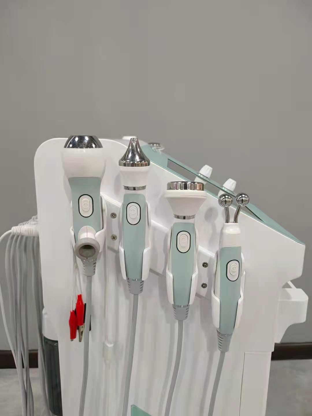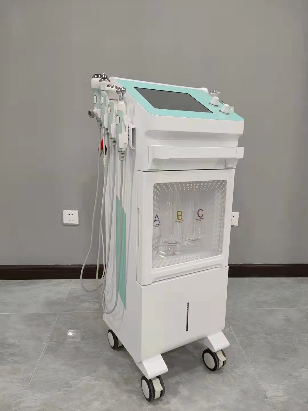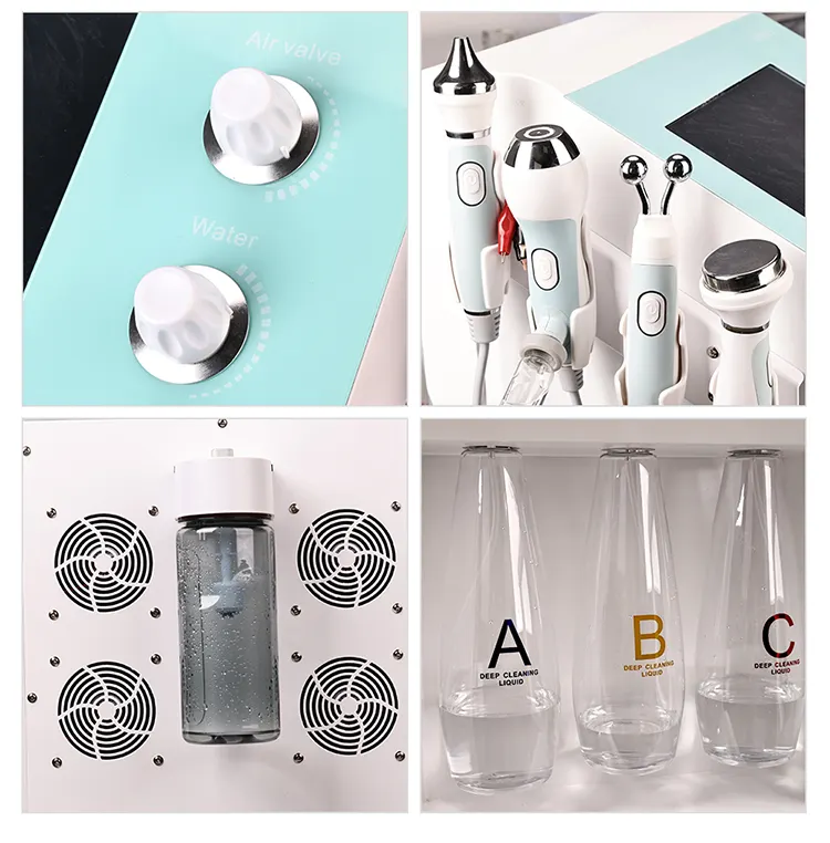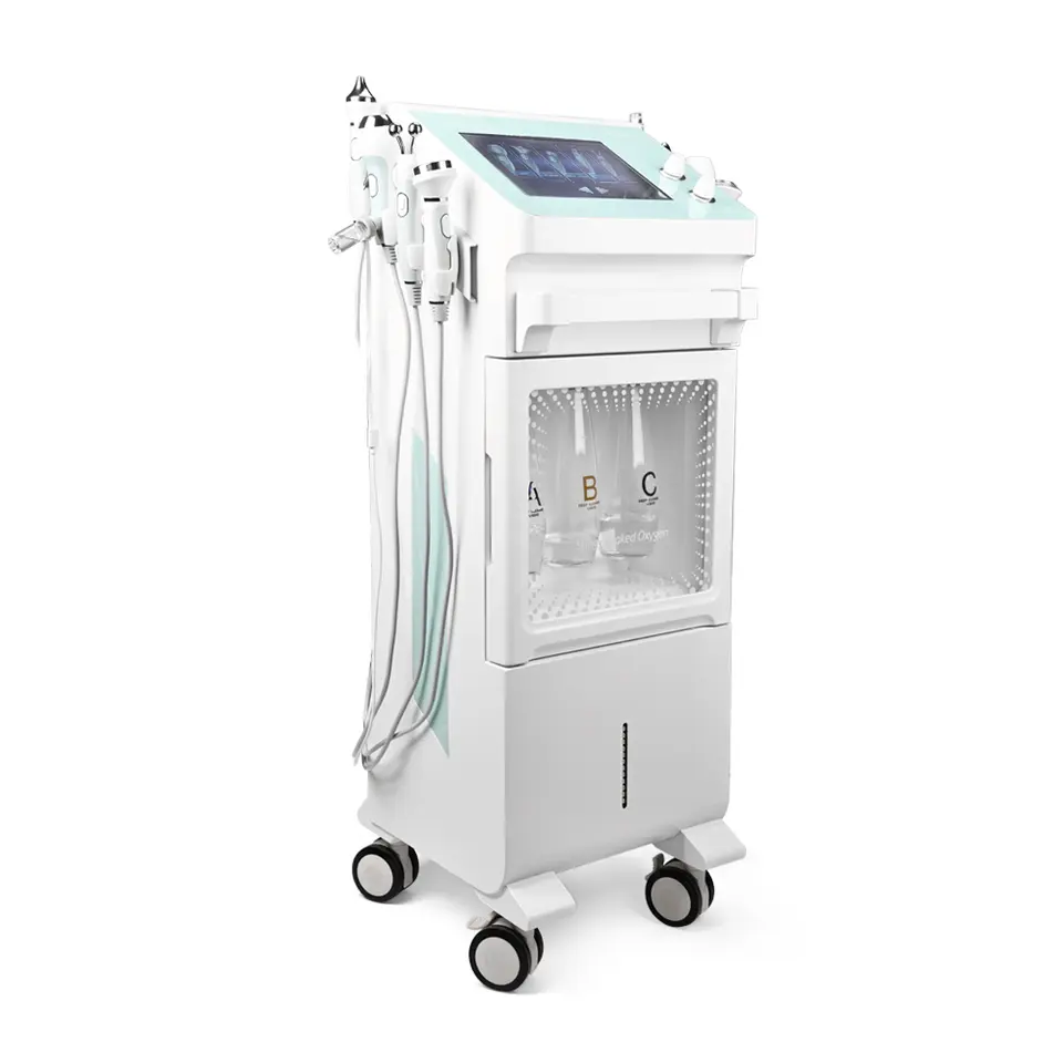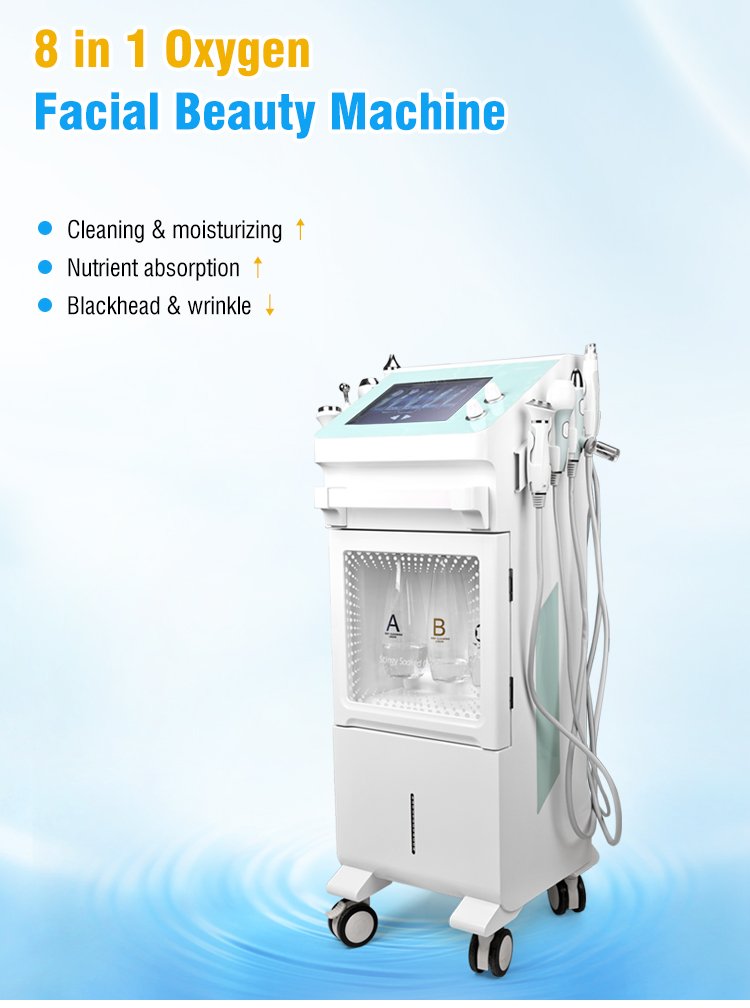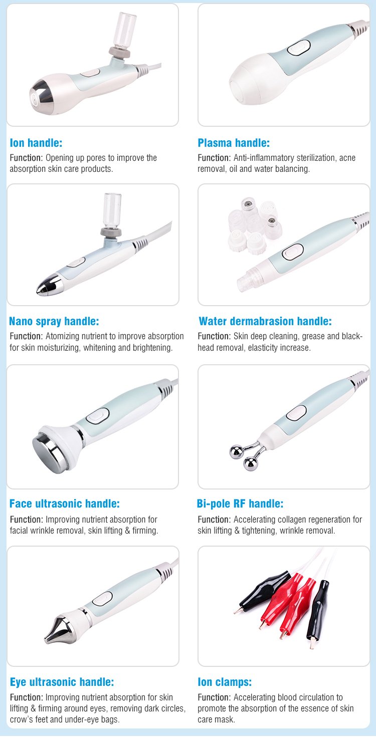 This is YT719 9‑in‑1 Oxygen Bubble Skin Synthesizer Machine integrating deep cleaning, nutrition infusion, bactericidal anti‑inflammation, firming anti‑aging, eye care and hot & cold soothing. It is equipped with 8 professional handles: water mill cleaning, nano spray, plasma oxygen bubble, ion meso, two‑stage RF, eye ultrasonic, facial ultrasonic, ion clamp and hot & cold care.It can remove blackheads, control oil & anti‑acne, brighten skin tone, lift face, shrink pores, hydrate skin and non‑invasively infuse nutrients.