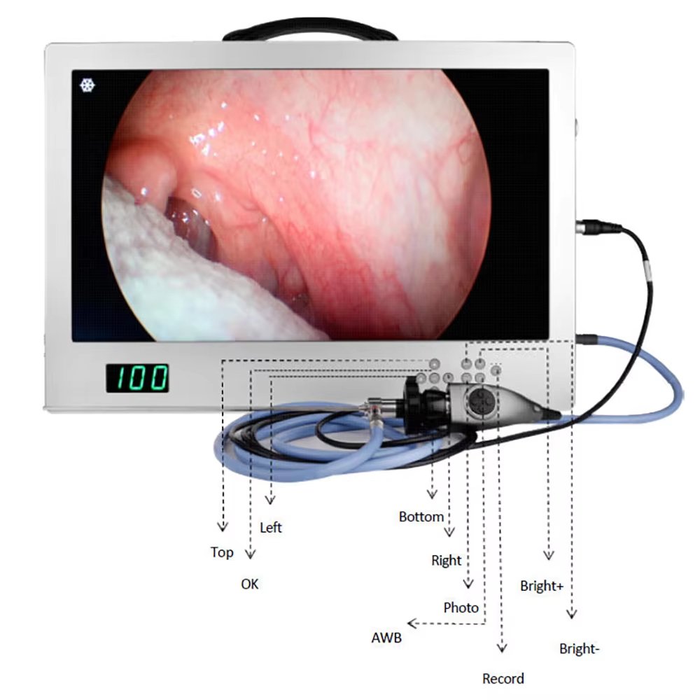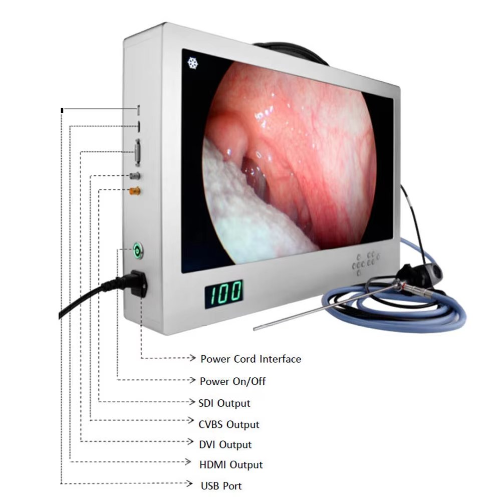 This machine is the YT726 032 4 in 1 Integrated Endoscopic HD Camera System, integrating a 24-inch medical-grade HD monitor, an IP67/IPX8 waterproof camera head, an H.264 high-efficiency video recorder, and a built-in 80W LED cold light source. It adopts a 1/1.8″ SONY CMOS sensor, supporting 1920×1080P 60fps progressive scanning with clear image, low noise and high brightness.The camera head supports soaking and autoclave sterilization, with customizable buttons and 8 groups of surgeon scene storage. It supports lifetime software upgrade and OEM/ODM service. Equipped with rich interfaces (HDMI/DVI/SDI/CVBS/USB) and functions like recording, AWB and freeze, it features an anti-magnetic aluminum alloy chassis, ideal for various minimally invasive endoscopic surgeries.
